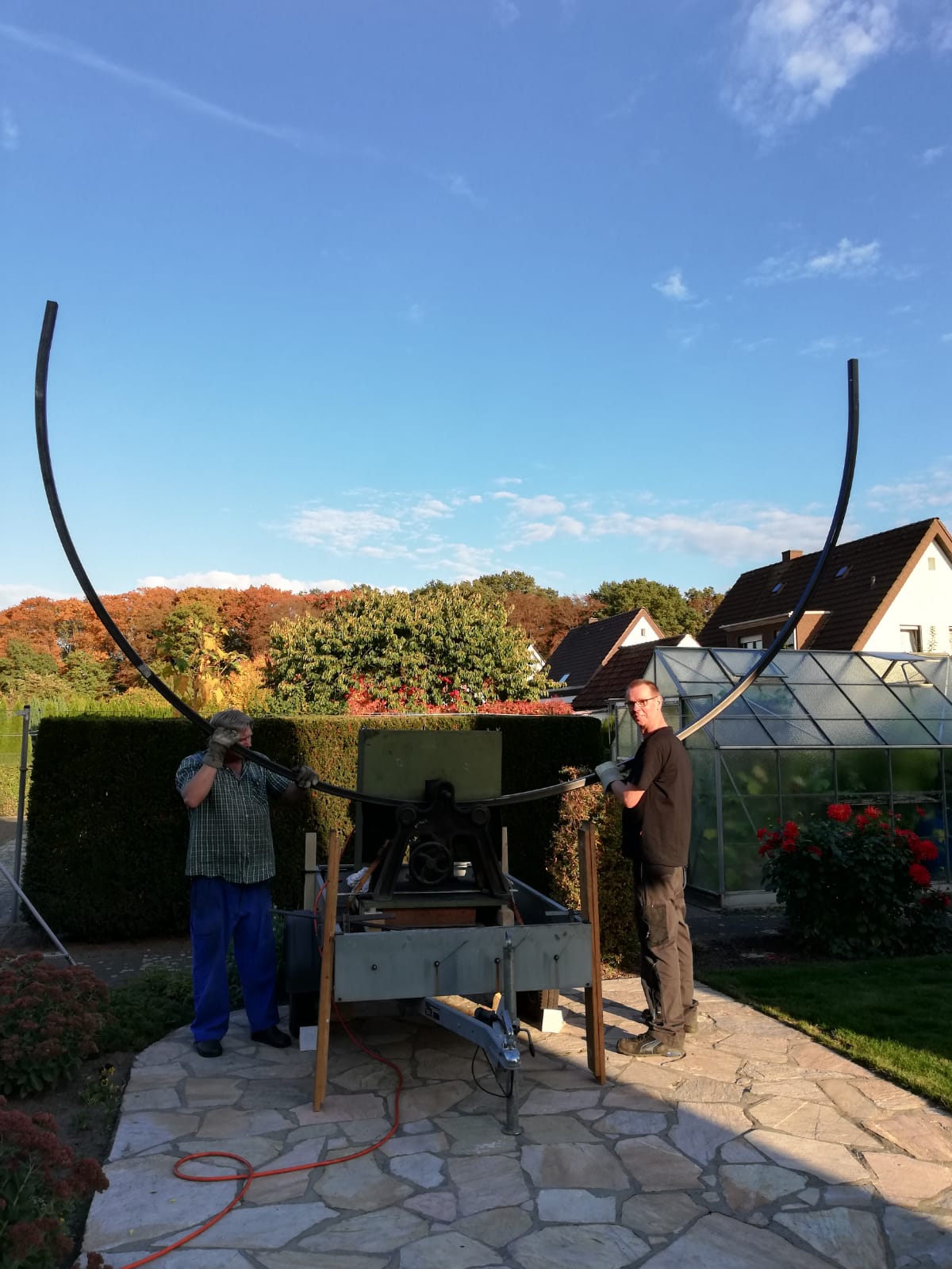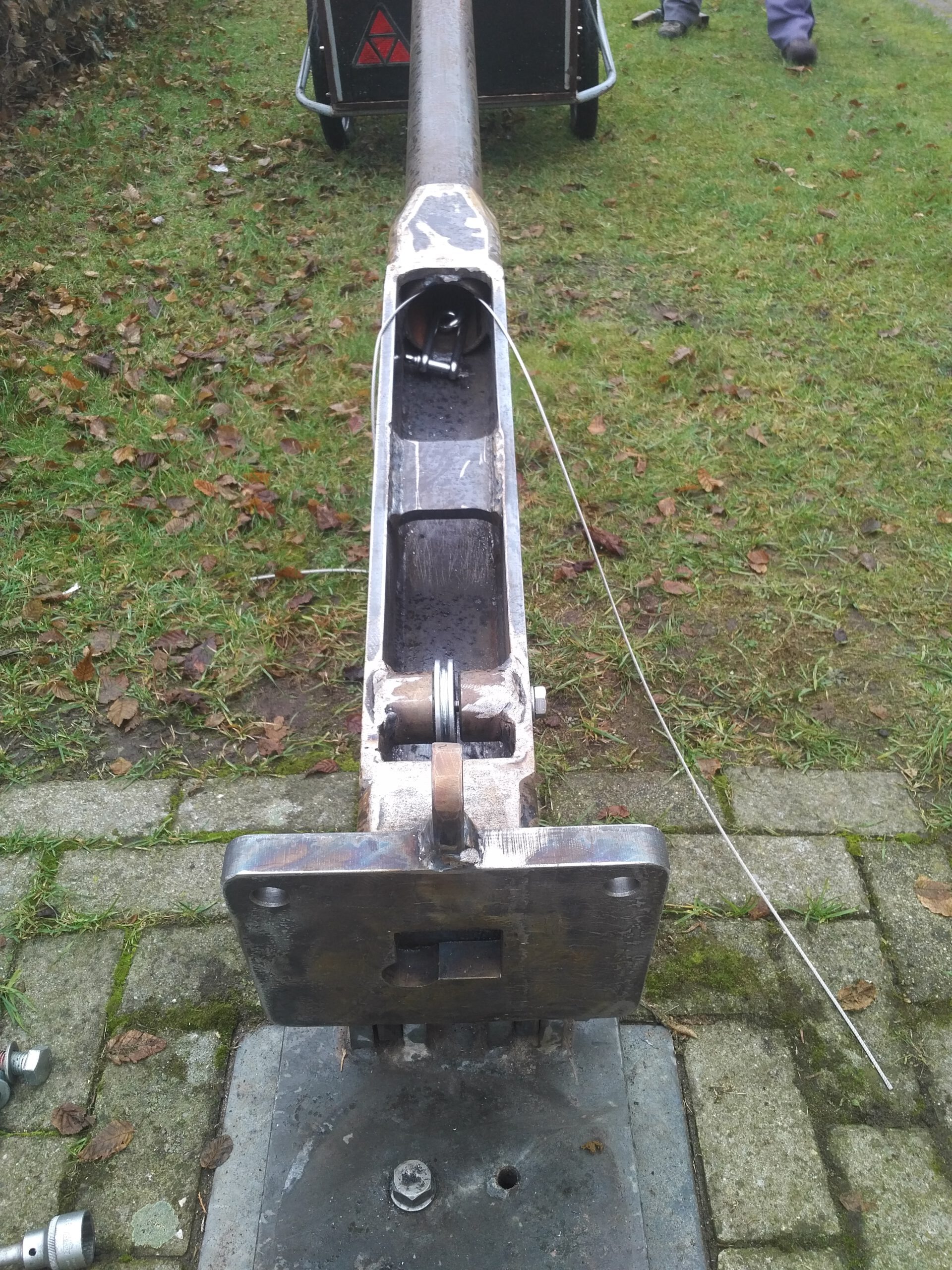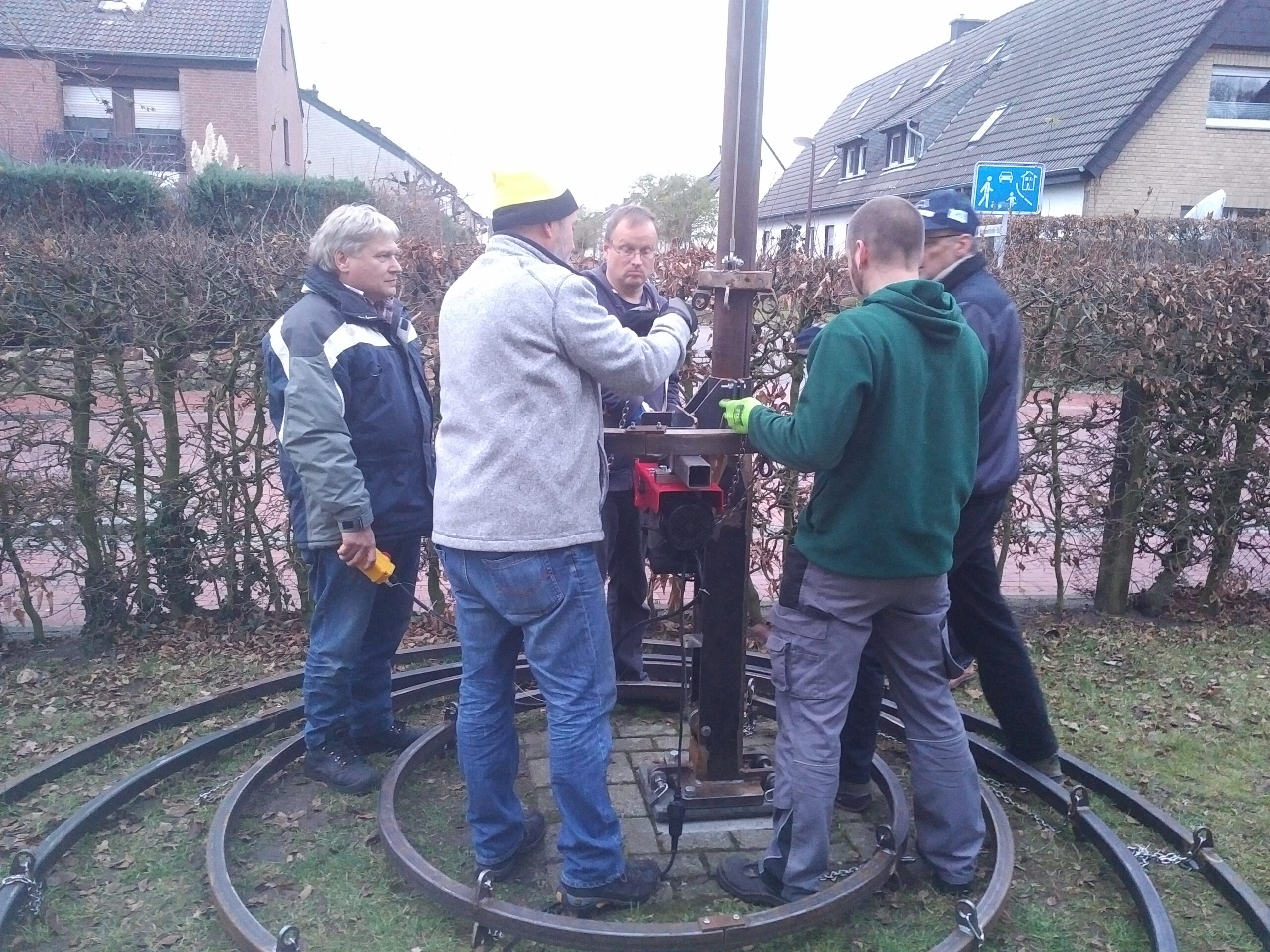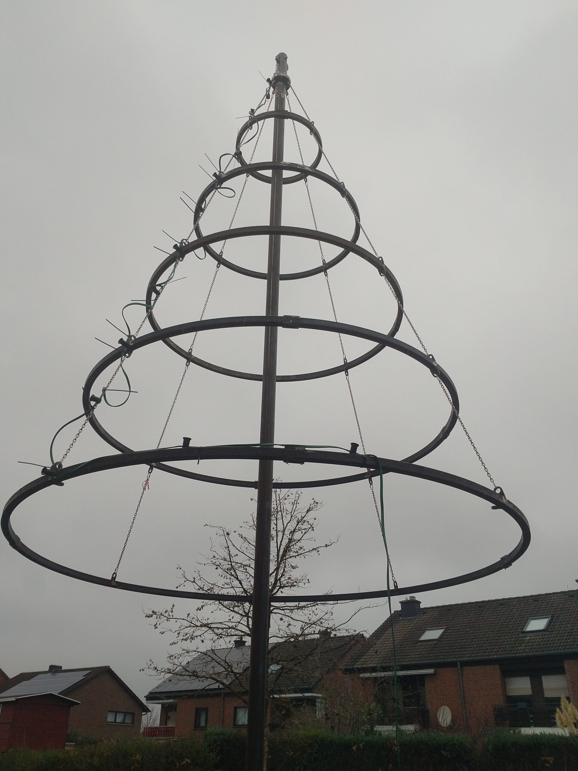 Im Herbst 2018 baut Udo Raschka einen neuen stählernen Kombibaum. Er hat einen innenliegend Flaschenzug. Mit dieser Zugvorrichtung werden künftig der Maibaumkranz, bzw. die neugestalteten Weihnachtsbaumringe in die Höhe gebracht. Das lästige und gefährliche Umlegen des Baumes entfällt.